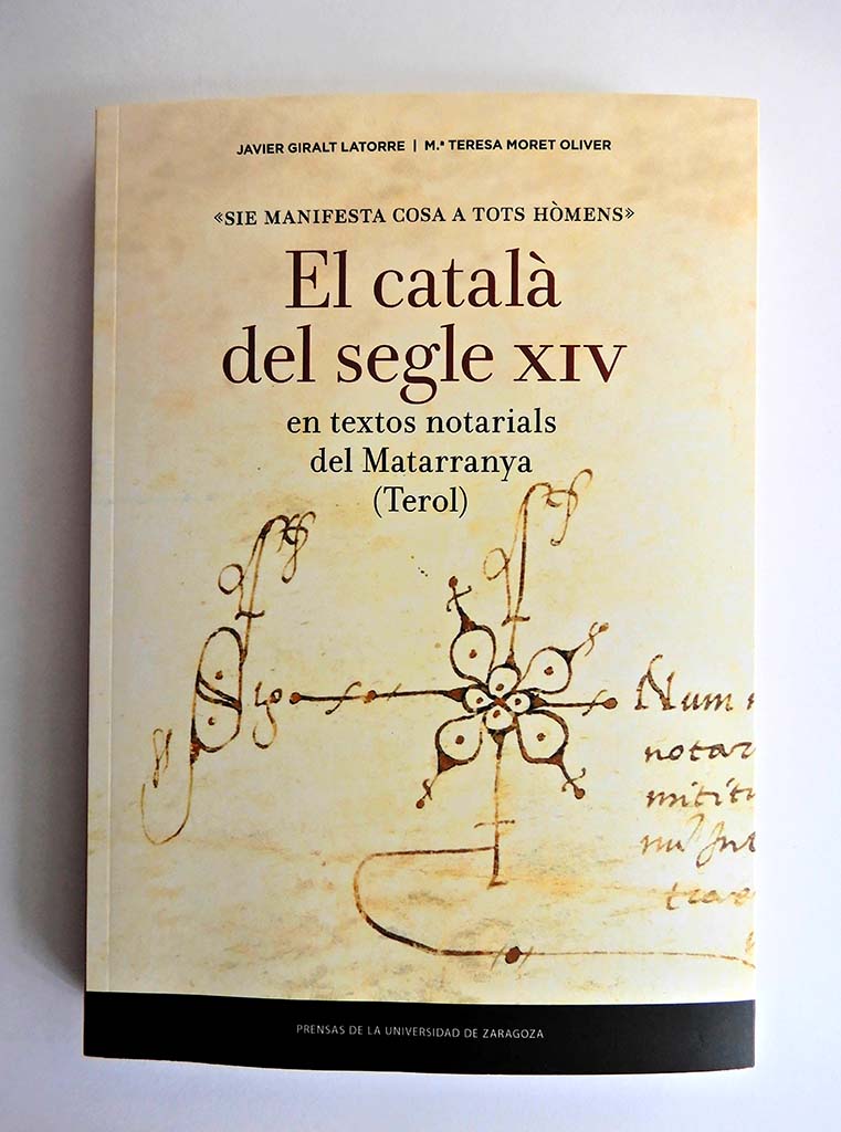 // Artur Quintana Fa ben poc ha aparegut el llibre: Sie manifesta cosa a tots hòmens. El català del segle XIV en textos notarials del Matarranya (Terol) de Javier Giralt i María Teresa Moret de la Universitat de Saragossa, publicat per les Prensas Universitarias d’aqueixa universitat, ben editat i il·lustrat. Els autors tenen merescuda fama