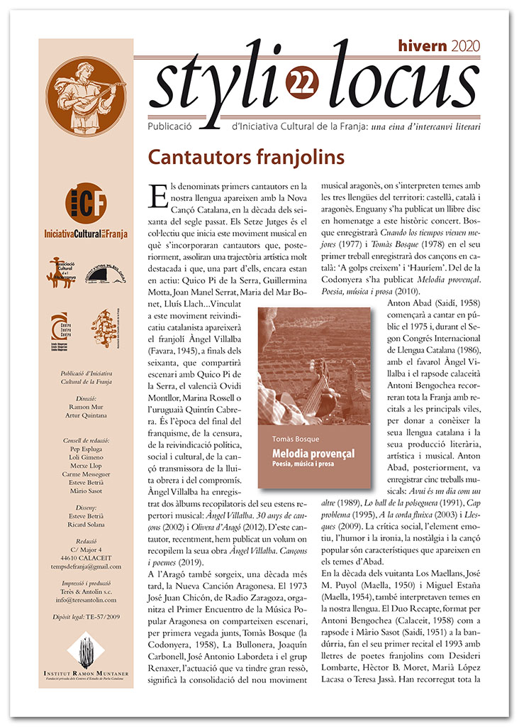 // Artur Quintana* Aprofito en nom d’en Ramon Mur i meu per a demanar-vos col·laboració, o que en demaneu a companys, amics, i saludats, per a l’Styli locus de l’estiu de 2020 –la data de lliurament és per als volts del 10 de juny. Els textos, en principi, han de ser inèdits.