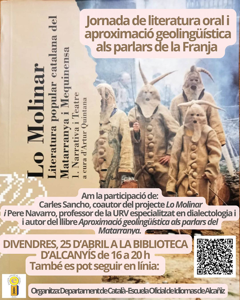 El 25 d’abril a la tarda, el programa va traslladar-se esta volta a la Biblioteca d’Alcanyís, també en línia, «Jornada de literatura oral i aproximació geolingüística als parlars de la Franja». Carles Sancho, coautor del projecte «Lo Molinar», enguany compleix trenta anys de la seua publicació, parlà de com es va generar la investigació, quin va ser el resultat de la recerca i quins altres treballs sobre literatura popular s’hi han publicat. La xarrada comptà amb la presència del doctor Artur Quintana, l’iniciador del projecte. L’arxivera d’Alcanyís, Teresa Thomson, ens explicà com una part dels materials musicals del Molinar es poden consultar per internet a través del Catálogo Artístico, Monumental y Cultural del Bajo Aragón, en l’apartat de Catálogo del Patrimonio Musical que ella s’ha encarregat de coordinar. Per acabar la sessió programada el professor de dialectologia de la Universitat Rovira i Virgili Pere Navarro dissertà sobre la geolingüística del Matarranya històric. Autor i coautor, respectivament, dels llibres sobre el Matarranya històric: Aproximació geolingüística als parlars del Matarranya(2005) i Literatura oral a Faió, Favara, Maella i Nonasp(2005). Els alumnes dels cursos de català que van seguir les xarrades hi van poder participar activament en directe o a través l’internet.