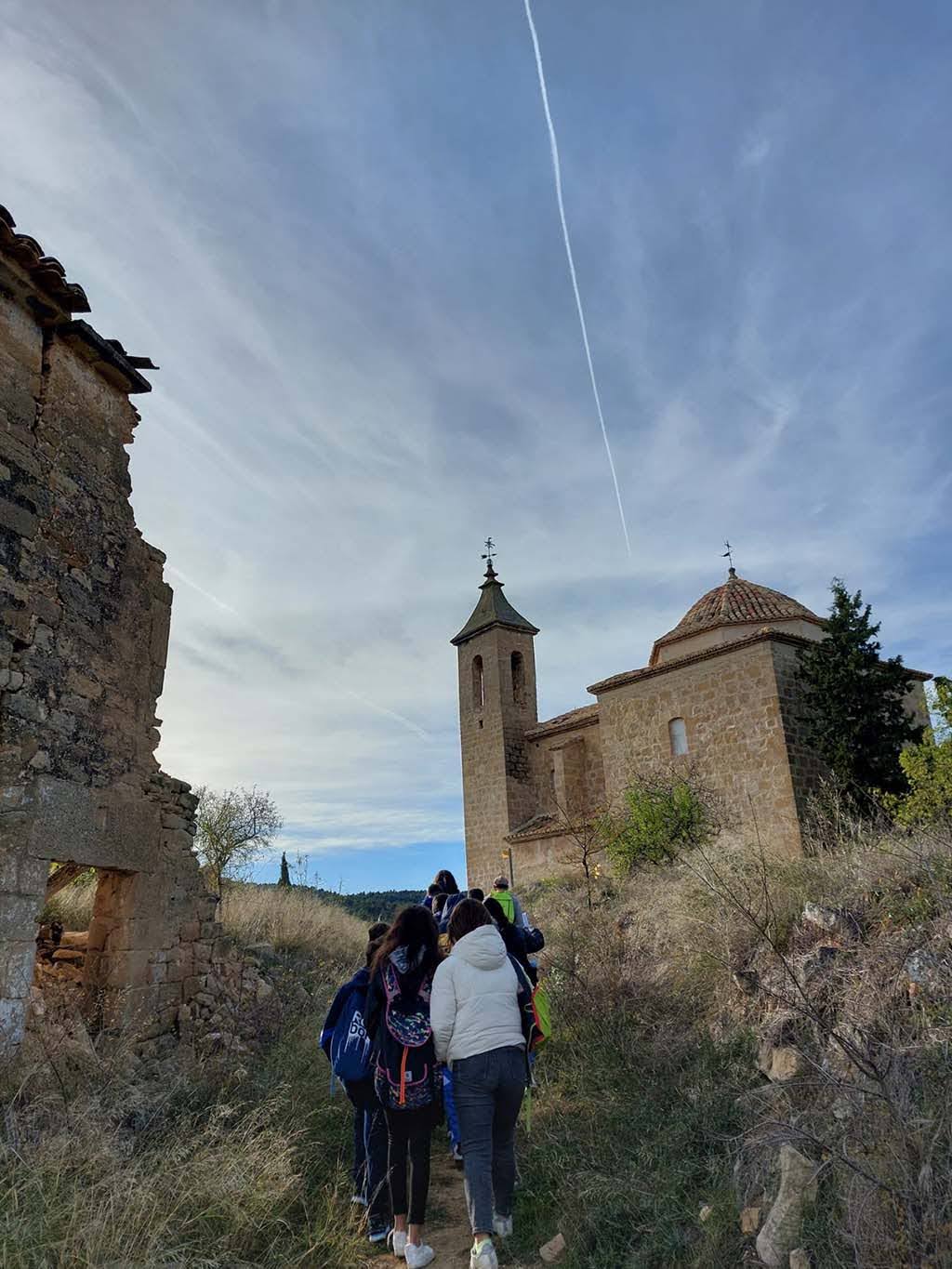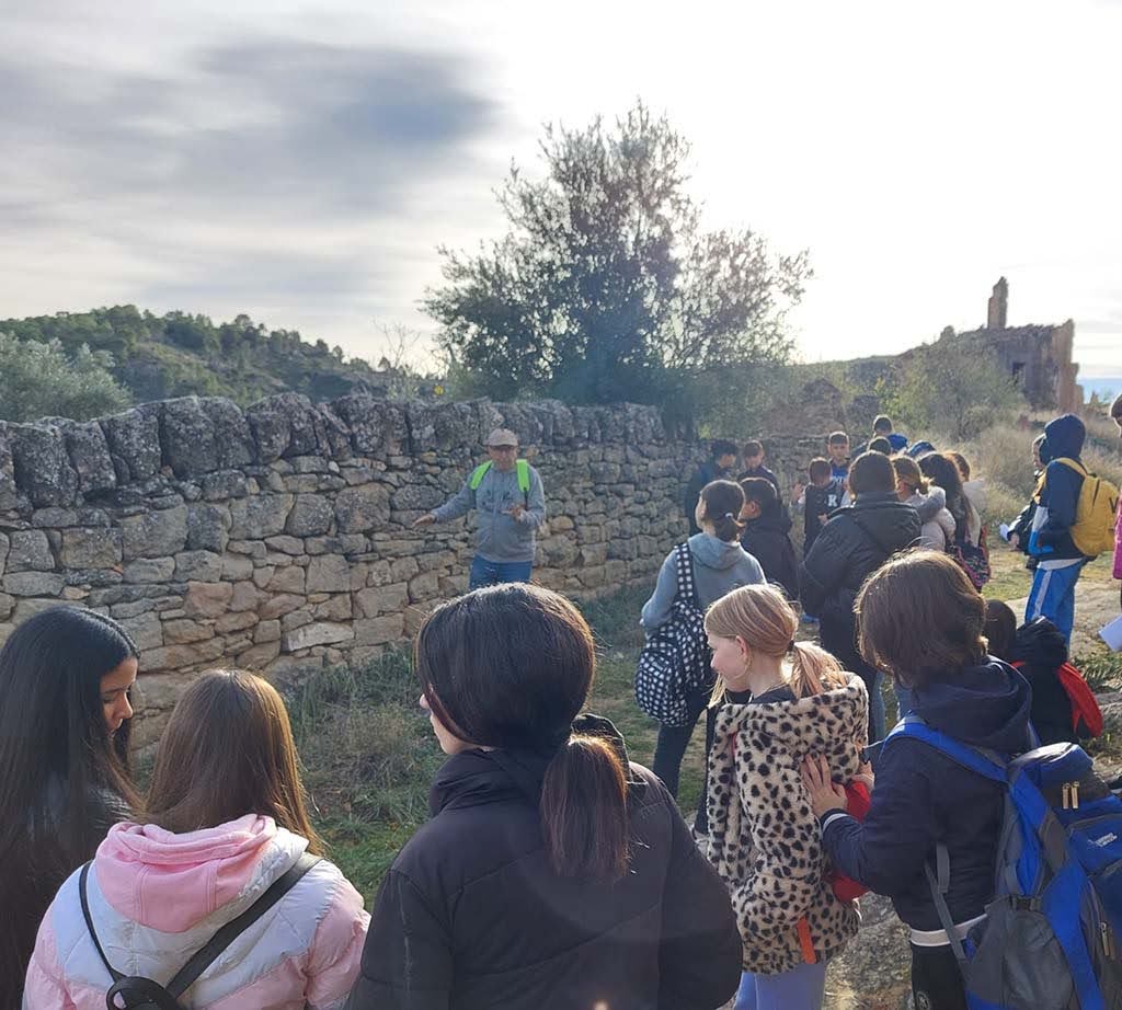 divideix en dos parts, uns van a visitar amb autobús Solo Houses, situades al terme de Queretes, i la resta al Mas de Llaurador. En acabat el recorregut a mig matí canvien de lloc. El Mas és un poble abandonat des del 1962, situat entre la Vall del Tormo i Valljunquera, on només queda en peu l’església de Sant Joan Degollat perquè les cases estan assolades i on mossen José Pellicer va crear una escola-residència el primer terç del segle passat molt valorada entre les viles del voltant. Aquí Carles Sancho va fer una breu història de la població, explicà la recent restauració de l’església i l’urbanisme de la vila i, per altra banda, Ana Casasús, tècnica de Patrimoni de la Comarca del Matarranya, mostrà als alumnes les principals característiques de les construccions tradicionals del nostre territori, les funcions per a què es creen, la seua distribució i els materials utilitzats que són els que tenien a l’abast, sense gaire elaboració. També el concepte de la construcció de la pedra seca tradicional.